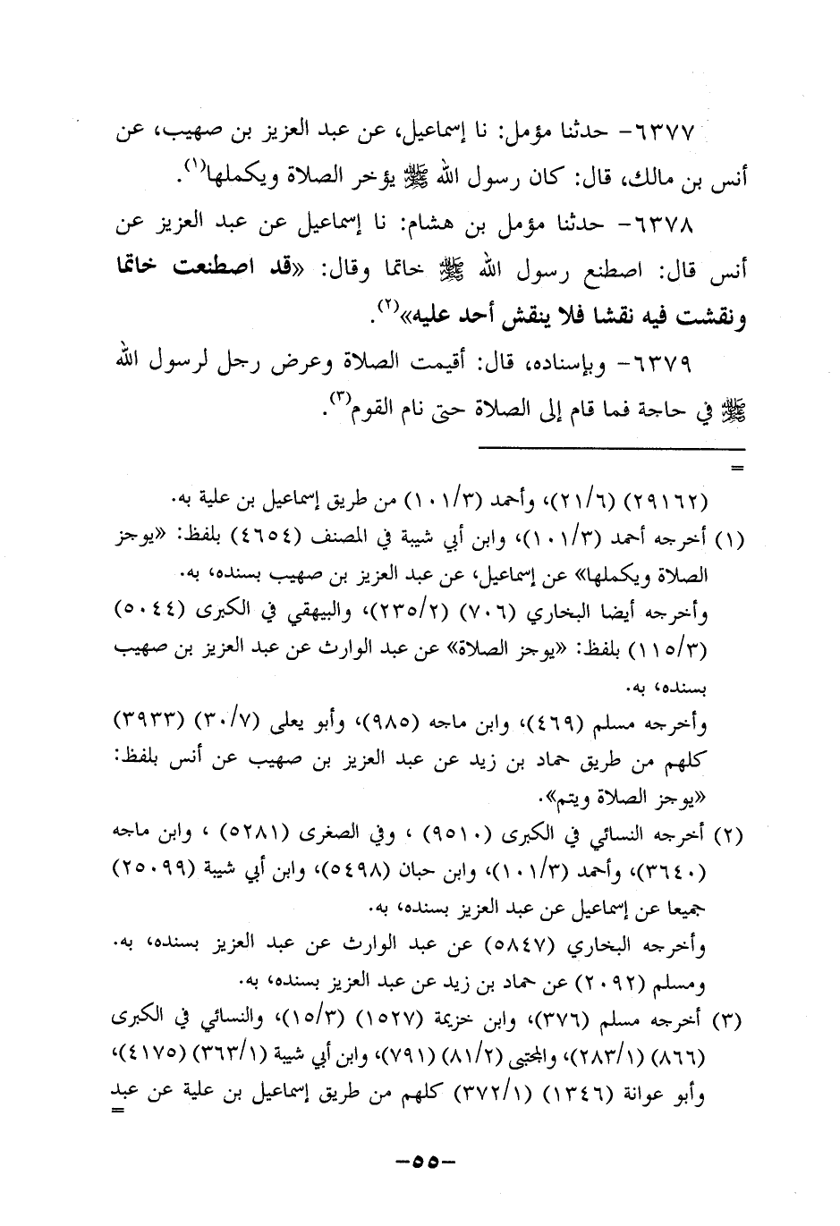 6377- حَدَّثنا مُؤَمَّل، حَدَّثنا إِسْمَاعِيلُ , عَنْ عَبْدِ الْعَزِيزِ بْنِ صُهَيْبٍ، عَن أَنَس بْنِ مَالِكٍ قَالَ: كَانَ رَسُولُ اللَّهِ صَلَّى اللَّهُ عَلَيْهِ وَسَلَّمَ يُؤَخِّرُ الصَّلاةَ وَيُكْمِلُهَا.