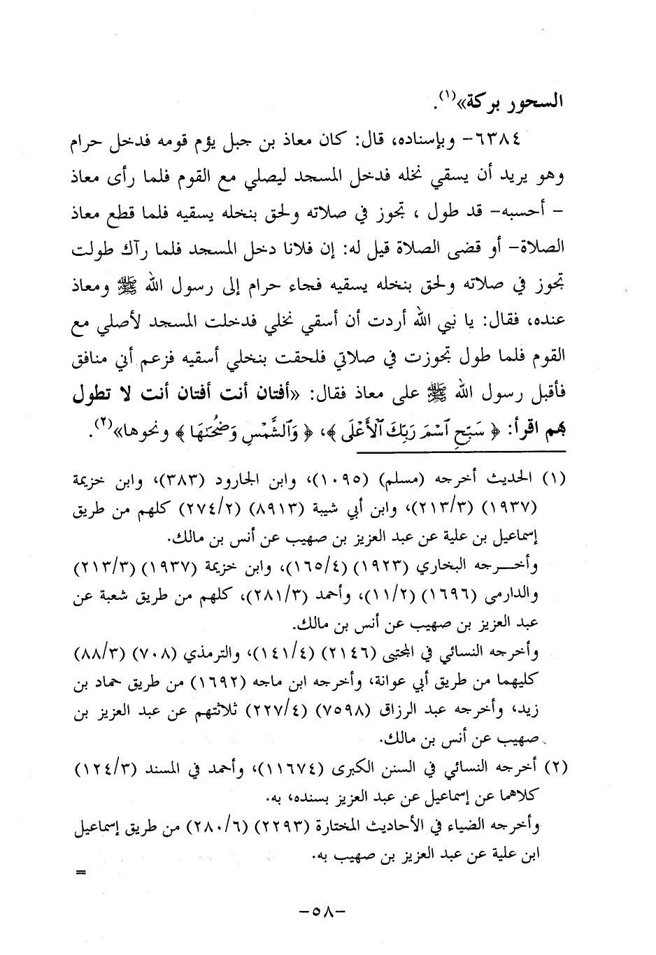 6384- وَبِإِسْنَادِهِ؛ قَالَ: كَانَ مُعَاذُ بْنُ جَبَلٍ يَؤُمُّ قَوْمَهُ فَدَخَلَ حَرَامٌ، وهُو يُرِيدُ أَنْ يَسْقِيَ نَخْلَهُ فَدَخَلَ الْمَسْجِدَ لِيُصَلِّيَ مَعَ الْقَوْمِ فَلَمَّا رأي معاذ أَحْسَبُهُ قَدْ طَوَّلَ تَجَوَّزَ فِي صَلاتِهِ وَلَحِقَ بِنَخْلِهِ يَسْقِيهِ فَلَمَّا قَطَعَ مُعَاذٌ الصَّلاةَ، أَوْ قَضَى الصَّلاةَ قِيلَ لَهُ: إِنَّ فُلانًا دَخَلَ الْمَسْجِدَ فَلَمَّا رَآكَ طَوَّلْتَ تَجَوَّزَ فِي صَلاتِهِ وَلَحِقَ بِنَخْلِهِ يَسْقِيهِ فَجَاءَ حَرَامٌ إِلَى رَسُولِ اللَّهِ صَلَّى اللَّهُ عَلَيْهِ وَسَلَّمَ وَمُعَاذٌ عِنْدَهُ فقال: يانبي اللَّهِ أَرَدْتُ أَنْ أَسْقِيَ نَخْلِي فَدَخَلْتُ الْمَسْجِدَ لأُصَلِّيَ مَعَ الْقَوْمِ فَلَمَّا طَوَّلَ تَجَوَّزْتُ فِي صَلاتِي فَلَحِقْتُ بِنَخْلِي أَسْقِيهِ فَزَعَمَ أَنِّي مُنَافِقٌ فَأَقْبَلَ رَسُولُ اللَّهِ صَلَّى اللَّهُ عَلَيْهِ وَسَلَّمَ عَلَى مُعَاذٍ فَقَالَ: أَفَتَّانٌ أَنْتَ أَفَتَّانٌ أَنْتَ لا تُطَوِّلْ بِهِمُ اقْرَأْ: {سبح اسم ربك الأعلي} {والشمس وضحها} وَنَحْوَهَا.