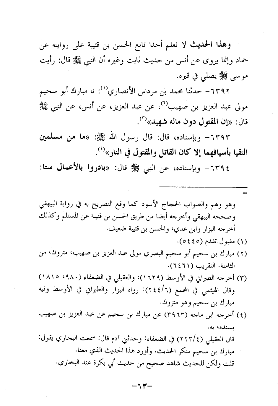 6392- حَدَّثنا محمد بن مرداس الأنصاري، حَدَّثنا مُبَارَكٌ أَبُو سُحَيْمٍ مَوْلَى عَبْدِ الْعَزِيزِ بْنِ صُهَيْبٍ , عَنْ عَبْدِ الْعَزِيزِ، عَن أَنَس، عَن النَّبِيّ صَلَّى اللَّهُ عَلَيْهِ وَسَلَّمَ قَالَ: إِنَّ الْمَقْتُولَ دُونَ مَالِهِ شَهِيدٌ.