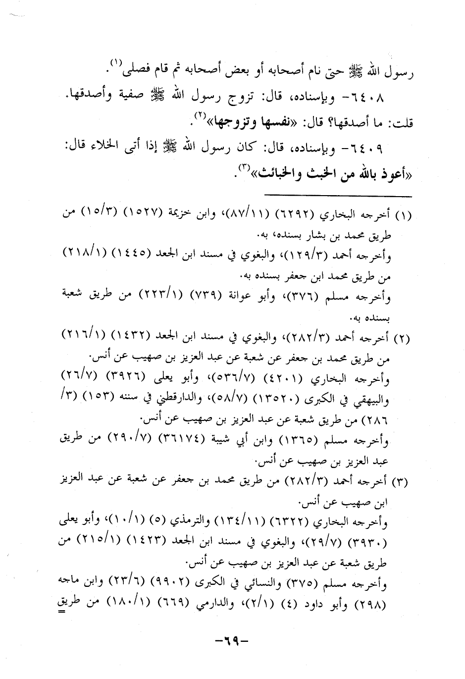 6409- وَبِإِسْنَادِهِ؛ قَالَ: كَانَ رَسُولُ اللَّهِ صَلَّى اللَّهُ عَلَيْهِ وَسَلَّمَ إِذَا أَتَى الْخَلاءَ قَالَ: أَعُوذُ بِاللَّهِ مِنَ الْخُبْثِ وَالْخَبَائِثِ.