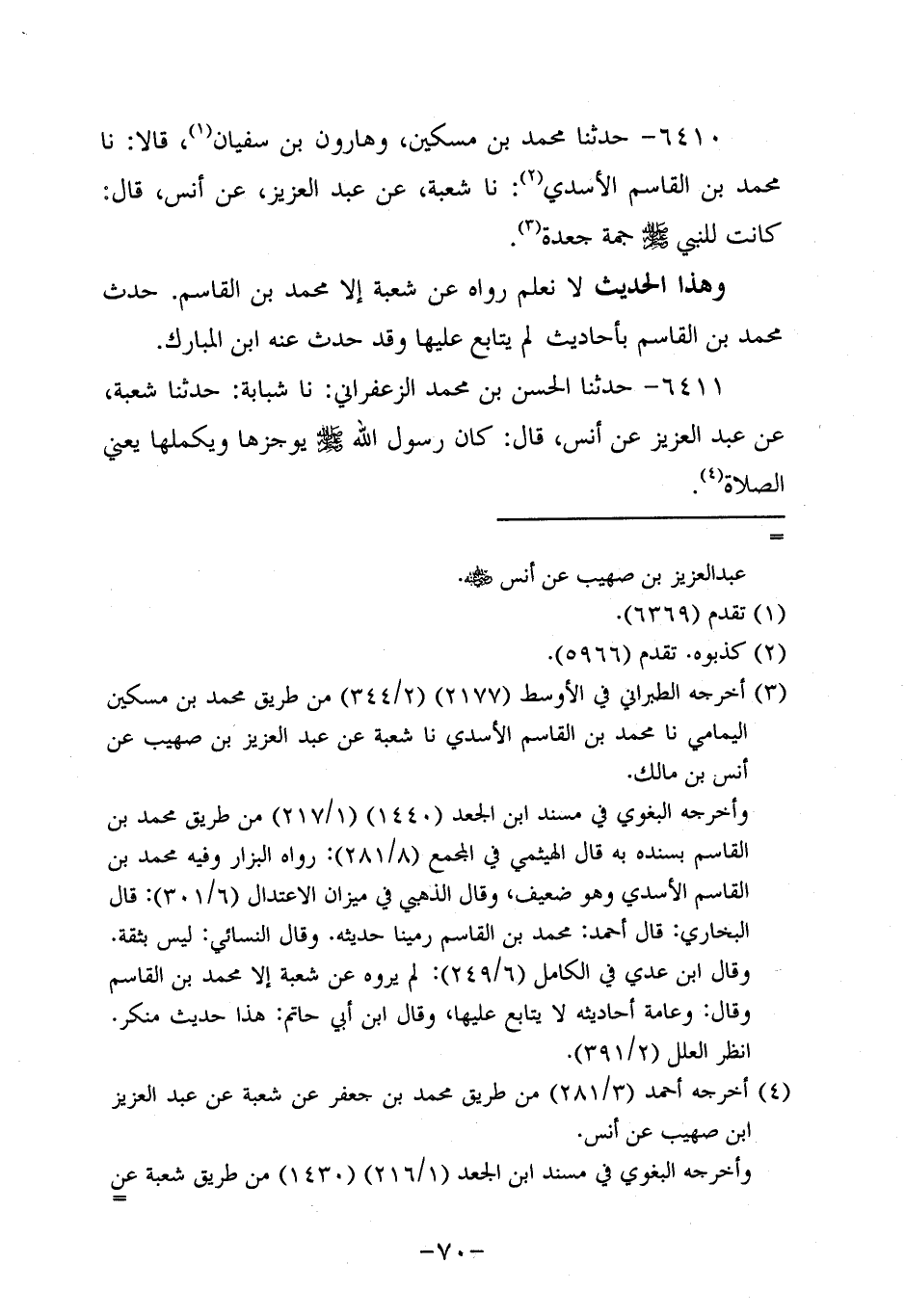 6410- حَدَّثنا مُحَمَّدُ بْنُ مِسْكِينٍ وَهَارُونُ بْنُ سُفيان، قالاَ: حَدَّثنا محمد بن القاسم الأسدي، حَدَّثنا شُعْبَةُ , عَنْ عَبْدِ الْعَزِيزِ، عَن أَنَسٍ، قَالَ: كَانَتْ لِلنَّبِيِّ صَلَّى اللَّهُ عَلَيْهِ وَسَلَّمَ جُمَّةٌ جَعِدَةٌ.