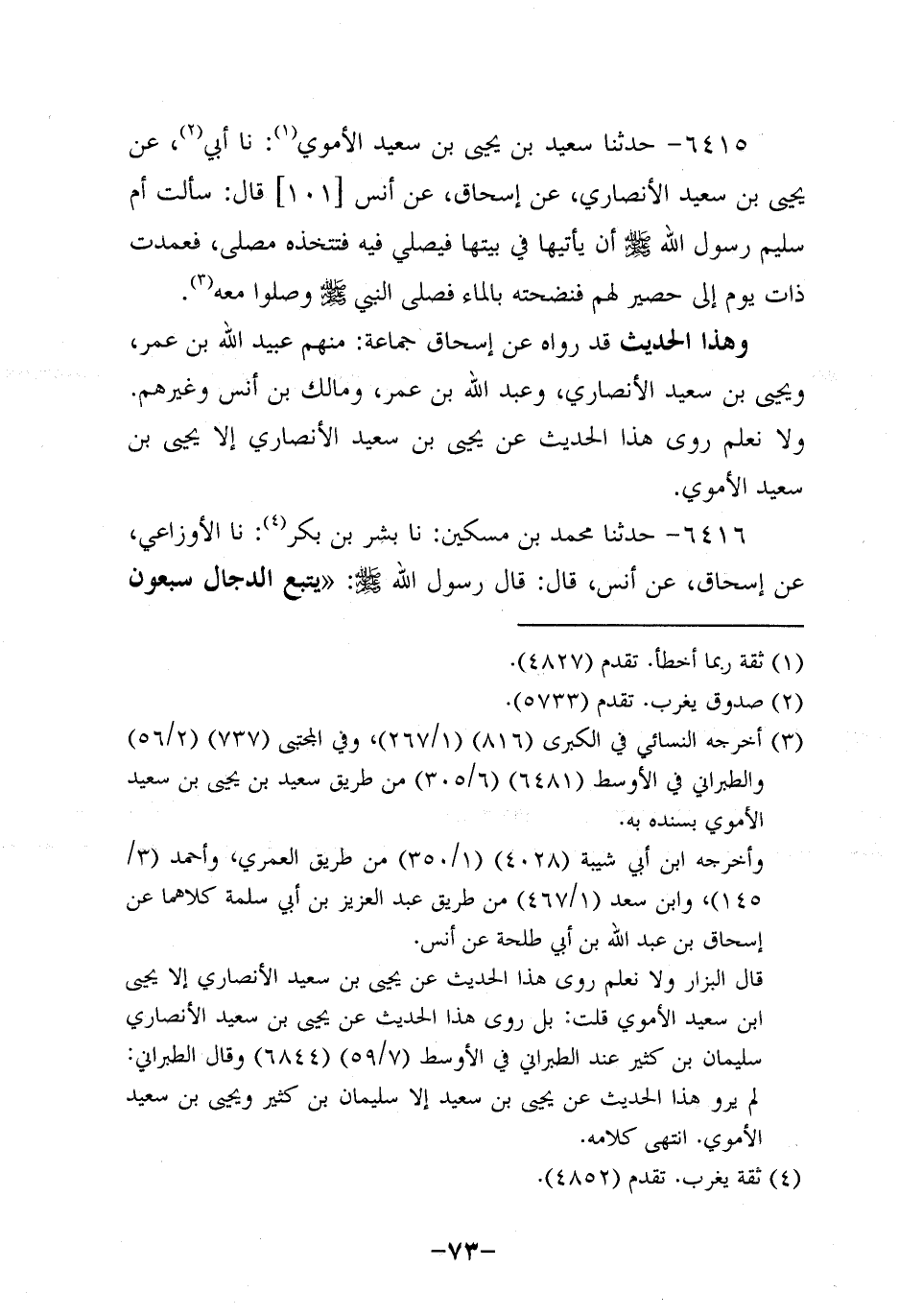 6416- حَدَّثنا محمد بن مسكين، حَدَّثنا بِشْر بن بكر، حَدَّثنا الأَوزَاعِيّ , عَنْ إِسْحَاقَ، عَن أَنَسٍ، قَالَ: قَالَ رَسُولُ اللَّهِ صَلَّى اللَّهُ عَلَيْهِ وَسَلَّمَ: يَتْبَعُ الدَّجَّالَ سَبْعُونَ أَلْفًا مِنْ يَهُودِ أَصْبَهَانَ أو مِنْ يَهُودِيَّةِ أَصْبَهَانَ عَلَيْهِمُ الطَّيَالِسَةُ.