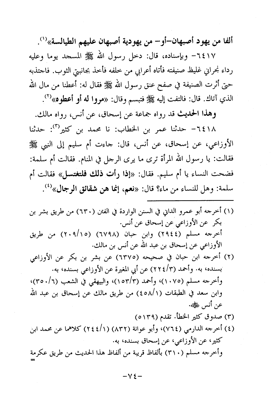 6418- حَدَّثنا عُمَر بن الخطاب، حَدَّثنا مُحَمَّدُ بْنُ كَثِيرٍ، حَدَّثنا الأَوزَاعِيّ , عَنْ إِسْحَاقَ، عَن أَنَسٍ، قَالَ: جَاءَتْ أُمُّ سُلَيْمٍ إِلَى النَّبِيّ صَلَّى اللَّهُ عَلَيْهِ وَسَلَّمَ فَقَالَتْ: يَا رَسولَ اللهِ الْمَرْأَةُ تَرَى مَا يَرَى الرَّجُلُ فِي الْمَنَامِ فَقَالَتْ أُمُّ سَلَمَةَ: فَضَحْتِ النِّسَاءَ يَا أُمَّ سُلَيْمٍ فَقَالَ: إِذَا رَأَتْ ذَلِكَ فَلْتَغْتَسِلْ فَقَالَتْ أُمُّ سَلَمَةَ: وَهَلْ لِلنِّسَاءِ مِنْ مَاءٍ؟ قَالَ: نَعَمْ إِنَّمَا هُنَّ شَقَائِقُ الرِّجَالِ.