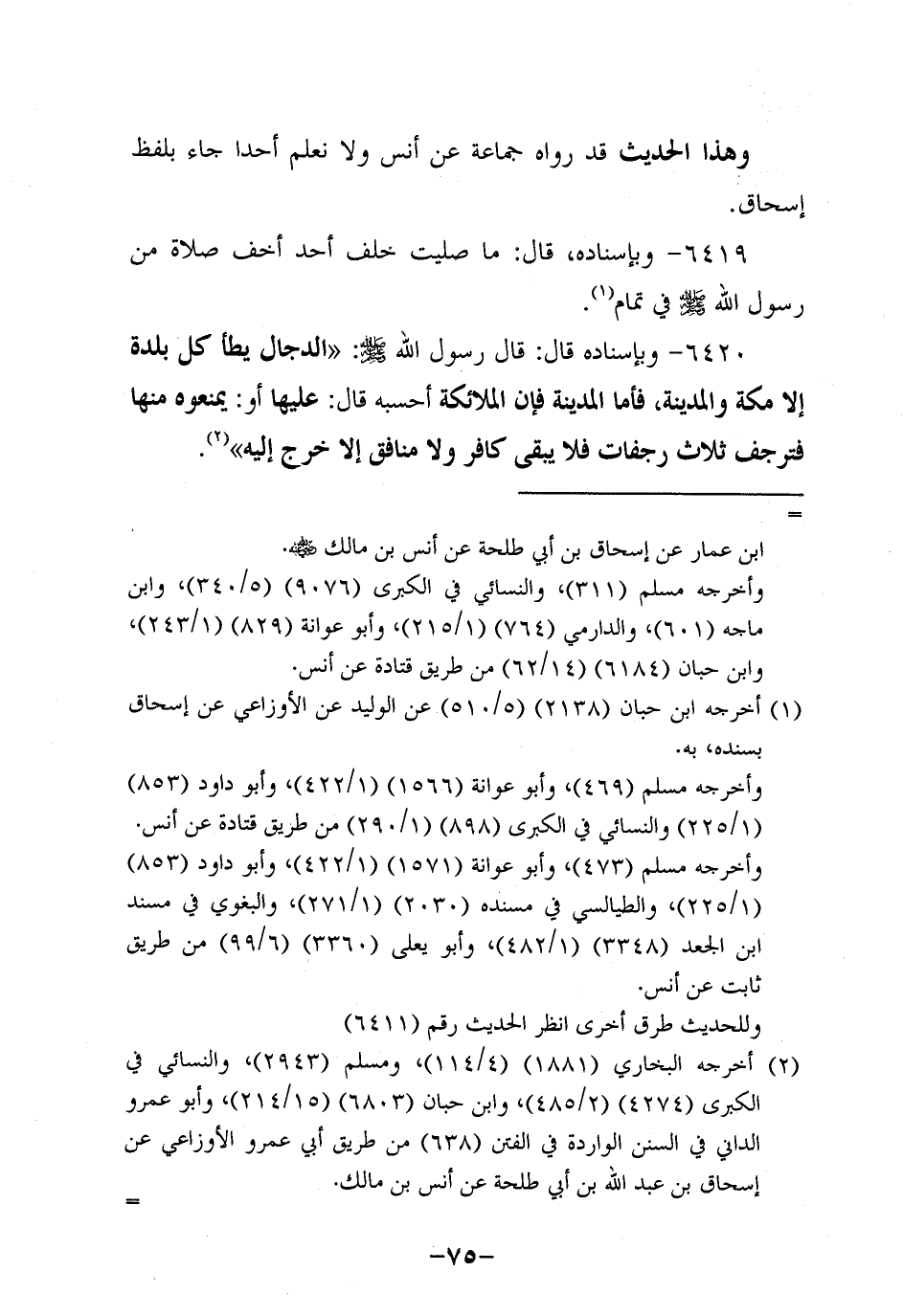 6420- وَبِإِسْنَادِهِ؛ قَالَ: قَالَ رَسُولُ اللَّهِ صَلَّى اللَّهُ عَلَيْهِ وَسَلَّمَ: الدَّجَّالُ يَطَأُ كُلَّ بَلْدَةٍ إلاَّ مَكَّةَ وَالْمَدِينَةَ فَأَمَّا الْمَدِينَةُ فَإِنَّ الْمَلائِكَةَ أَحْسَبُهُ قَالَ: عَلَيْهَا، أَوْ يَمْنَعُوهُ مِنْهَا فَتَرْجُفُ ثَلاثَ رَجَفَاتٍ فَلا يَبْقَى كَافِرٌ، ولاَ مُنَافِقٌ إلاَّ خرج إليه.