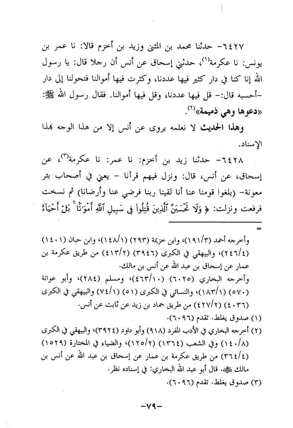 6428- حَدَّثنا زَيْد بن أَخْزَم، حَدَّثنا عُمَر، حَدَّثنا عِكْرِمَةُ , عَنْ إِسْحَاقَ، عَن أَنَسٍ، قَالَ: وَنَزَّلَ فِيهِمْ قُرْآنًا، يَعْنِي فِي أَصْحَابِ بِئْرِ مَعُونَةَ: بَلِّغُوا قَوْمَنَا عَنَّا أَنَّا لَقِينَا رَبَّنَا فَرَضِيَ عَنَّا وَأَرْضَانَا، ثُمَّ نُسِخَتْ فَرُفِعَتْ وَنَزَلَتْ: {وَلا تَحْسَبَنَّ الَّذِينَ قُتِلُوا فِي سَبِيلِ اللَّهِ أَمْوَاتًا بل أحياء عند ربهم يرزقون} .