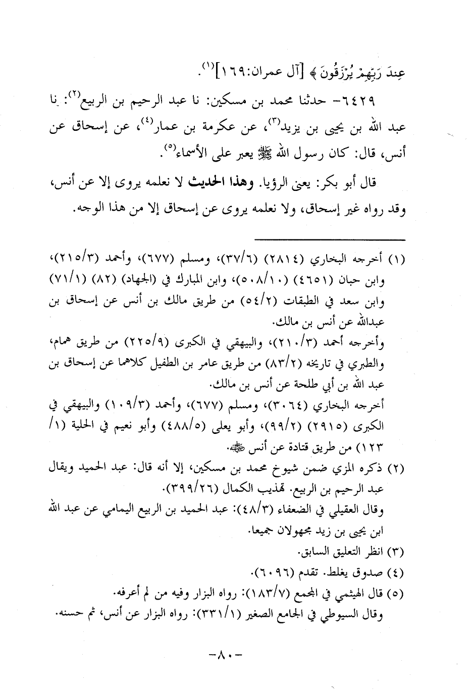 6429- حَدَّثنا محمد بن مسكين، حَدَّثنا عبد الرحيم بن الربيع، حَدَّثنا عَبْدُ اللَّهِ بْنُ يَحْيَى بْنِ يَزِيدَ عَنْ عِكْرِمَةَ بْنِ عَمَّارٍ , عَنْ إِسْحَاقَ، عَن أَنَسٍ، قَالَ: كَانَ رَسُولُ اللَّهِ صَلَّى اللَّهُ عَلَيْهِ وَسَلَّمَ يُعَبِّرُ عَلَى الأَسْمَاءِ.