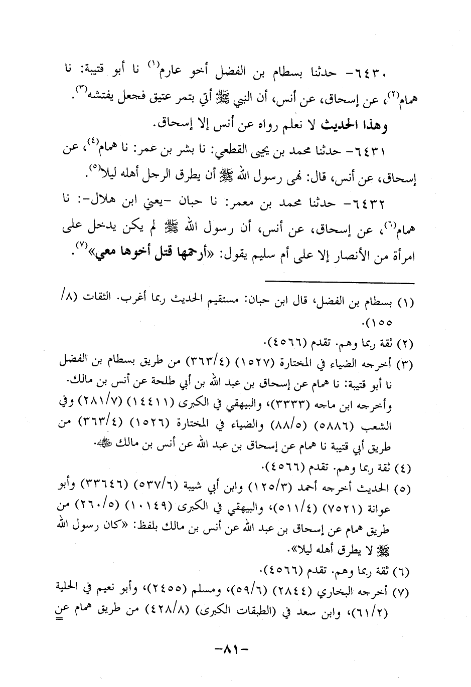 6431- حَدَّثنا محمد بن يحيي القطعي، حَدَّثنا بِشْر بن عُمَر، حَدَّثنا هَمَّامٌ , عَنْ إِسْحَاقَ، عَن أَنَسٍ، قَالَ: نَهَى رَسُولُ اللَّهِ صَلَّى اللَّهُ عَلَيْهِ وَسَلَّمَ إِنَّ يَطْرُقَ الرَّجُلُ أَهْلَهُ لَيْلا.