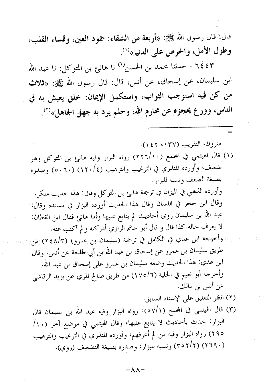 6443- حَدَّثنا محمد بن الحسن، حَدَّثنا هانيء بن المتوكل، حَدَّثنا عَبْدُ اللَّهِ بْنُ سُلَيْمَانَ , عَنْ إِسْحَاقَ، عَن أَنَسٍ، قَالَ: قَالَ رَسُولُ اللَّهِ صَلَّى اللَّهُ عَلَيْهِ وَسَلَّمَ: ثَلاثٌ مَنْ كُنَّ فِيهِ اسْتَوْجَبَ الثَّوَابَ وَاسْتَكْمَلَ الإِيمَانَ: خُلُقٌ يَعِيشُ بِهِ فِي النَّاسِ وَوَرَعٌ يَحْجِزُهُ عَنْ مَحَارِمِ اللَّهِ وَحِلْمٌ يَرُدُّ بِهِ جَهْلَ الْجَاهِلِ.