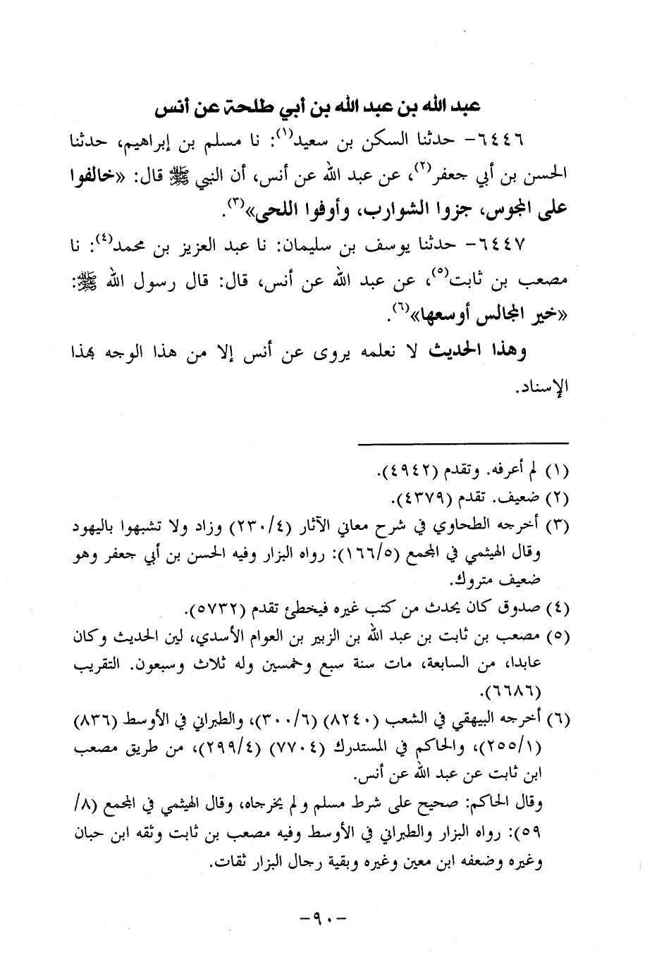 6446- حَدَّثنا السَّكَنُ بْنُ سَعِيدٍ، حَدَّثنا مُسْلِمُ بْنُ إِبْرَاهِيمَ، حَدَّثنا الْحَسَنُ بْنُ أَبِي جَعْفَرٍ , عَنْ عَبْدِ اللَّهِ، عَن أَنَس؛ أَنَّ النَّبِيّ صَلَّى اللَّهُ عَلَيْهِ وَسَلَّمَ قَالَ: خَالِفُوا عَلَى الْمَجُوسِ جُزُّوا الشَّوَارِبَ وَأَوْفُوا اللِّحَى.