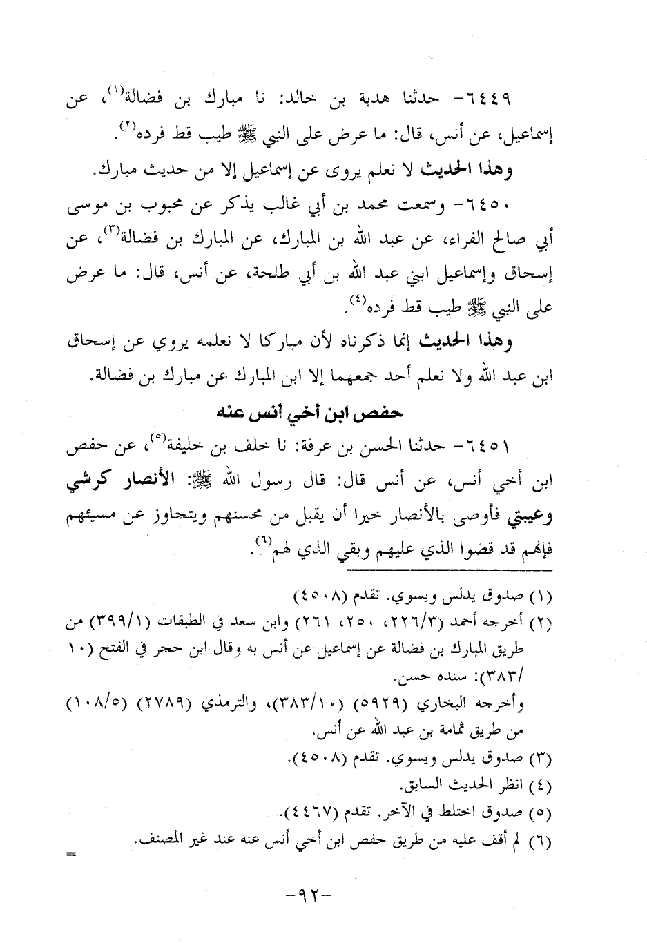 وَهَذَا الْحَدِيثُ إِنَّمَا ذَكَرْنَاهُ لأَنَّ مُبَارَكًا لا نَعْلَمُهُ يَرْوِي عَنْ إِسْحَاقَ ابن عبد الله، ولاَ نعلمُ أحد جَمَعَهُمَا إلاَّ ابْنُ الْمُبَارَكِ عَنْ مُبَارَكِ بْنِ فضالة.