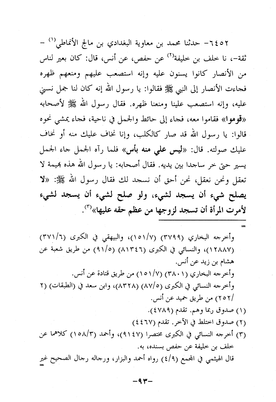 6452- حَدَّثنا محمد بن معاوية البغدادي بن مالج الأنماطي ثقة، حَدَّثنا خَلَفُ بْنُ خَلِيفَةَ , عَنْ حَفْصٍ، عَن أَنَسٍ، قَالَ: كَانَ بَعِيرٌ لِنَاسٍ مِنَ الأَنْصَارِ كَانُوا يَسْنُونَ عَلَيْهِ وَإِنَّهُ اسْتَصْعَبَ عَلَيْهِمْ وَمَنَعَهُمْ ظَهْرَهُ فَجَاءَتِ الأَنْصَارُ إِلَى النَّبِيّ صَلَّى اللَّهُ عَلَيْهِ وَسَلَّمَ فَقَالُوا: يَا رَسولَ اللهِ إِنَّهُ كَانَ لَنَا جَمَلٌ نُسْنِي عَلَيْهِ وَإِنَّهُ اسْتَصْعَبَ عَلَيْنَا وَمَنَعَنَا ظَهْرَهُ فَقَالَ رَسُولُ اللَّهِ صَلَّى اللَّهُ عَلَيْهِ وَسَلَّمَ لأَصْحَابِهِ: قُومُوا فَقَامُوا مَعَهُ، فَجَاءَ إِلَى حائطٍ، والجملُ فِي ناحيةٍ، فَجَاءَ يَمْشِي نَحْوَهُ قَالُوا: يَا رَسولَ اللهِ قَدْ صَارَ كَالْكَلْبِ وَإِنَّا نَخَافُ عَلَيْكَ مِنُه، أَوْ نَخَافُ عَلَيْكَ صَوْلَتَهُ قَالَ: لَيْسَ عَلَيَّ مِنْهُ بَأْسٌ فَلَمَّا رَآهُ الْجَمَلُ جَاءَ الْجَمَلُ يَسِيرُ حَتَّى خَرَّ سَاجِدًا بَيْنَ يَدَيْهِ فَقَالَ أَصْحَابُهُ: يَا رَسولَ اللهِ هَذِهِ بَهِيمَةٌ لَا تَعْقِلُ، وَنَحْنُ نَعْقِلُ، نَحْنُ أَحَقُّ أَنْ نَسْجُدَ لَكَ، فَقَالَ رَسُولُ اللَّهِ صَلَّى اللَّهُ عَلَيْهِ وَسَلَّمَ: لا يَصْلُحُ شَيْءٌ أَنْ يَسْجُدَ لِشَيْءٍ، وَلَوْ صَلُحَ لِشَيْءٍ أَنْ يَسْجُدَ لِشَيْءٍ لأَمَرْتُ الْمَرْأَةَ أَنْ تَسْجُدَ لِزَوْجِهَا مِنْ عِظَمِ حَقِّهِ عَلَيْهَا.