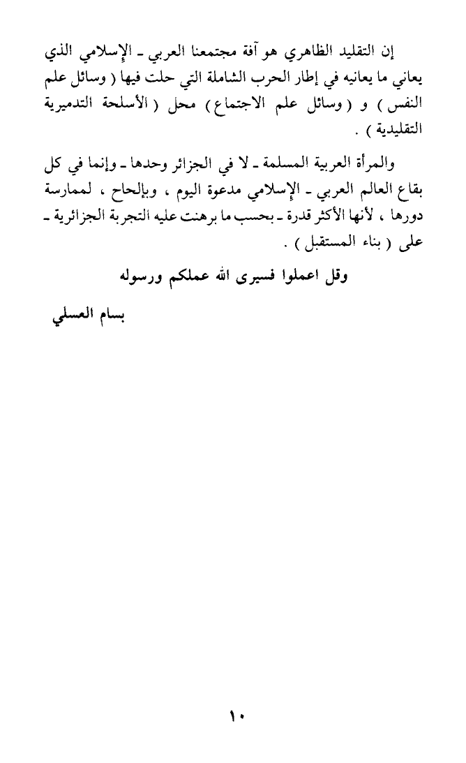 والمرأة العربية المسلمة - لا في الجزائر وحدها - وإنما في كل بقاع العالم العربي - الإسلامي مدعوة اليوم، وبإلحاح، لممارسة دورها، لأنها الأكثر قدرة - بحسب ما برهنت عليه التجربة الجزائرية - على (بناء المستقبل).