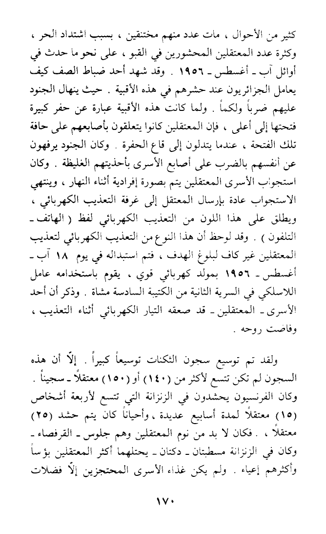 كثير من الأحوال، مات عدد منهم مختنقين، بسبب اشتداد الحر، وكثرة عدد المعتقلين المحشورين في القبو، على نحو ما حدث في أوائل آب - أغسطس - 1956. وقد شهد أحد ضباط الصف كيف يعامل الجزائريون عند حشرهم في هذه الأقبية. حيث ينهال الجنود عليهم ضربا ولكما. ولما كانت هذه الأقبية عبارة عن حفر كبيرة فتحتها إلى أعلى، فإن المعتقلين كانوا يتعلقون بأصابعهم على حافة تلك الفتحة، عندما يتدلون إلى قاع الحفرة. وكان الجنود يرفهون عن أنفسهم بالضرب على أصابع الأسرى بأحذيتهم الغليظة. وكان استجواب الأسرى المعتقلين يتم بصورة إفرادية أثناء النهار، وينتهي الاستجواب عادة بإرسال المعتقل إلى غرفة التعذيب الكهربائي، ويطلق على هذا اللون من التعذيب الكهربائي لفظ (الهاتف - التلفون). وقد لوحظ أن هذا النوع من التعذيب الكهربائي لتعذيب المعتقلين غير كاف لبلوغ الهدف، فتم استبداله في يوم 18 آب - أغسطس - 1956 بمولد كهربائي قوي، يقوم باستخدامه عامل اللاسلكي في السرية الثانية من الكتيبة السادسة مشاة. وذكر أن أحد الأسرى - المعتقلين - قد صعقه التيار الكهربائي أثناء التعذيب، وفاضت روحه.