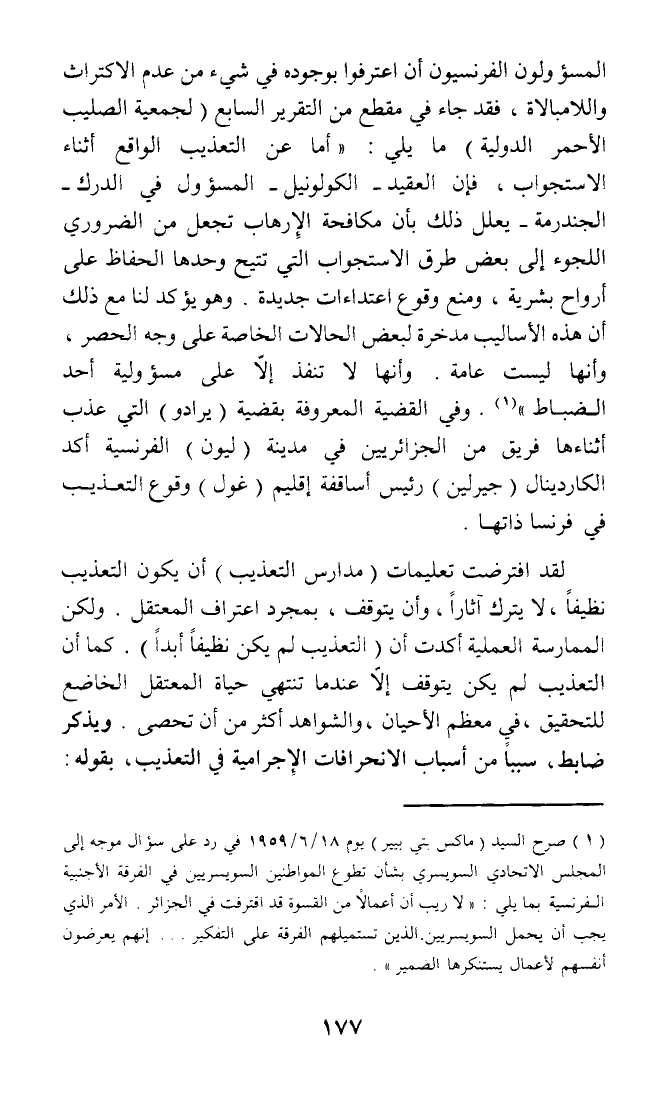 (¬1) صرح السيد (ماكس بتي بيير) يوم 18/ 6 / 1959 في رد على سؤال موجه إلى المجلس الاتحادي السويسري شأن تطوع المواطنين السويسريين في الفرقة الأجنبية الفرنسية بما يلي: (لا ريب أن أعمالا من القسوة قد اقترفت في الجزائر. الأمر الذي يجب أن يحمل السويسريين الذين تستميلهم الفرقة على التفكير ... إنهم يعرضون أنفسهم لأعمال يستنكرها الضمير)