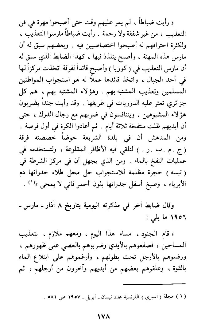 (رأيت ضباطا، لم يمر عليهم وقت حتى أصبحوا مهرة في فن التعذيب، من غير شفقة ولا رحمة. رأيت ضباطا مارسوا التعذيب، ولكثرة احترافهم له أصبحوا اختصاصيين فيه. وبعضهم سبق له أن مارس هذه المهنة، وأصبح يتلذذ فيها، كهذا الضابط الذي سبق له أن مارس التعذيب في (كوريا) وأصبح قائدا لفرقة اتخذت مركزا لها في أحد الجبال، واتخذ قائدها عملا له هو استجواب المواطنين المسلمين وتعذيب المشتبه بهم. وهؤلاء المشتبه بهم، هم كل جزائري تعثر عليه الدوريات في طريقها. وقد رأيت جندا يضربون هؤلاء المشبوهين، ويتنافسون في ضربهم مع رجال الدرك، حتى ان أيديهم ظلت منتفخة ثلاثة أيام. ثم أعادوا الكرة في أول فرصة. ومن المدهش أن في بلدة الشريعة حوضا خصصته فرقة (ج. م. ب. ر.) لتلقي فيه الأظافر المقلوعة، ولتستخدمه في عمليات النفخ بالماء. ومن الذي يجهل أن في مركز الشرطة في (تبسة) حجرة مظلمة للاستجواب حل محل طلاء جدرانها دم الأبرياء، وصبغ أسفل جدرانها بلون أحمر قاني لا يمحى. (¬1).