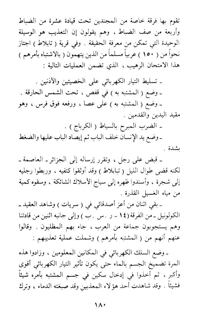 - بقي اثنان من أعز أصدقائي في (سريات) وشاهد العقيد - الكولونيل - من الفرقة (14 - ر. س. ب) وإلى جانبه اثنين من قادتنا وهم يستجوبون جماعة من العرب، جاء بهم المظليون. وقالوا عنهم أنهم من (المشتبه بأمرهم) وشملت عملية تعذيبهم - وضع السلك الكهربائي في المكانين المعلومين، وزادوا هذه المرة تضميخ الجسم بالماء حتى يكون تأثير التيار الكهربائي أقوى وأكبر، ثم أخذوا في إدخال سكين في جسم المشتبه بأمره شيئا فشيئا. وقد شاهدت أحد هؤلاء المعذبين وقد صبغته الدماء، وترك