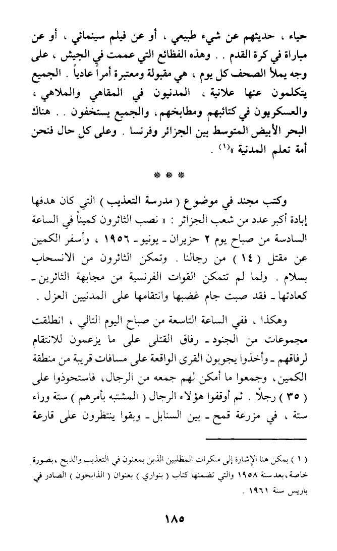 (¬1) يمكن هنا الإشارة إلى منكرات المظليين الذين يمعنون في التعذيب والذبح، بصورة خاصة، بعد سنة 1958 والتي تضمنها كتاب (بنواري) بعنوان (الذابحون) الصادر في باريس سنة 1961.