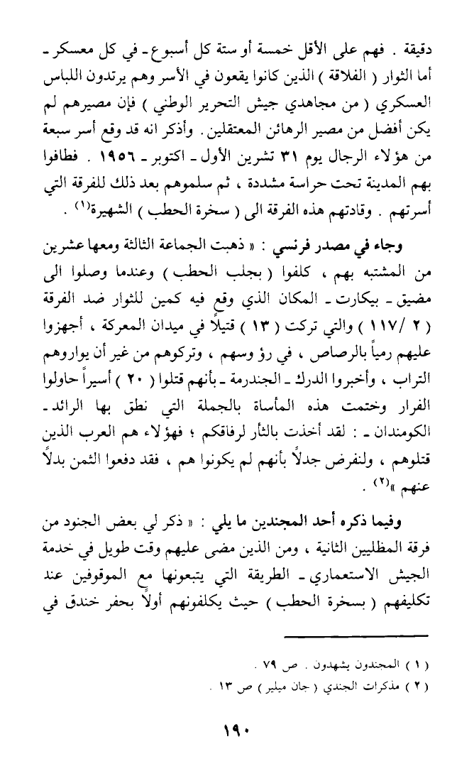 دقيقة. فهم على الأقل خمسة أو ستة كل أسبوع - في كل معسكر - أما الثوار (الفلاقة) الذين كانوا يقعون في الأسر وهم يرتدون اللباس العسكري (من مجاهدي جيش التحرير الوطني) فإن مصيرهم لم يكن أفضل من مصير الرهائن المعتقلين. وأذكر أنه قد وقع أسر سبعة من هؤلاء الرجال يوم 31 تشرين الأول - اكتوبر - 1956. فطافوا بهم المدينة تحت حراسة مشددة، ثم سلموهم بعد ذلك للفرقة التي أسرتهم. وقادتهم هذه الفرقة الى (سخرة الحطب) الشهيرة (¬1).