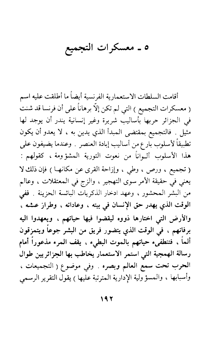 أقامت السلطات الاستعمارية الفرنسية أيضا ما أطلقت عليه اسم (معسكرات التجميع) التي لم تكن إلا برهانا على أن فرنسا قد شنت في الجزائر حربها بأساليب شريرة وغير إنسانية يندر أن يوجد لها مثيل. فالتجميع بمقتضى المبدأ الذي يدين به، لا يعدو أن يكون تطبيقا لأسلوب بارع من أساليب إبادة العنصر. وعندما يضيفون على هذا الأسلوب ألوانا من نعوت التورية المشؤومة، كقولهم: (تجميع، ورص، وطي، وإزاحة القرى عن مكانها) فإن ذلك لا يعني في حقيقة الأمر سوى التهجير، والزج في المعتقلات، وعالم من البشر المحشور، ومعهد ادخار الذكريات البائسة الحزينة. ففي الوقت الذي يهدر حق الإنسان في بيته، وعاداته، وطراز عشه، والأرض التي اختارها ذووه ليقضوا فيها حياتهم، ويعهدوا اليه برفاتهم، في الوقت الذي يتضرر فريق من البشر جوعا ويتمزقون ألما، فتطفيء حياتهم بالموت البطيء، يقف المرء مذعورا أمام رسالة الهمجية التي استمر الاستعمار يخاطب بها الجزائريين طوال الحرب تحت سمع العالم وبصره. وفي موضوع (التجميعات، وأسبابها، والمسؤولية الإدارية المترتبة عليها) يقول التقرير الرسمي