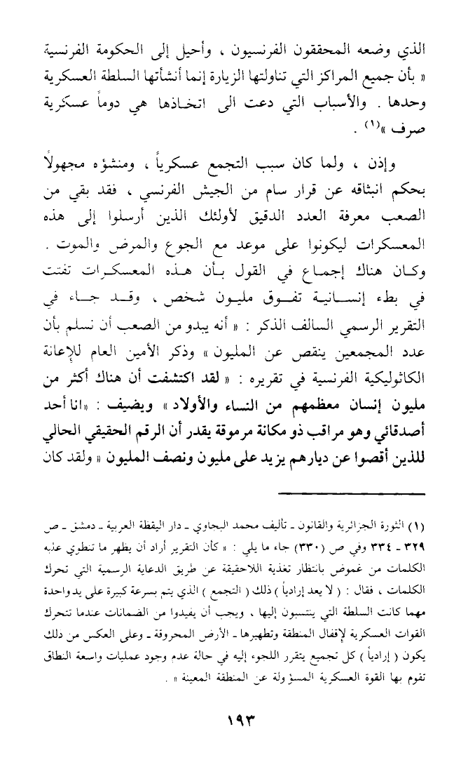 (¬1) الثورة الجرائرية والقانون - تأليف محمد البجاوي - دار اليقظة العربية - دمشق - ص 329 - 334 وفي ص (330) جاء ما يلي: (كأن التقرير أراد أن يظهر ما تنطوي عليه الكلمات من غموض بانتظار تغذية اللاحقيقة عن طريق الدعاية الرسمية التي تحرك الكلمات، فقال: (لا يعد إراديا) ذلك (التجمع) الذي يتم بسرعة كبيرة على يد واحدة مهما كانت السلطة التي ينتسبون إليها، ويجب أن يفيدوا من الضمانات عندما تتحرك القوات العسكرية لإقفال المنطقة وتطهيرها - الأرض المحروقة - وعلى العكس من ذلك يكون (إراديا) كل تجميع يتقرر اللجوء إليه في حالة عدم وجود عمليات واسعة النطاق تقوم بها القوة العسكرية المسؤولة عن المنطقة المعينة).
