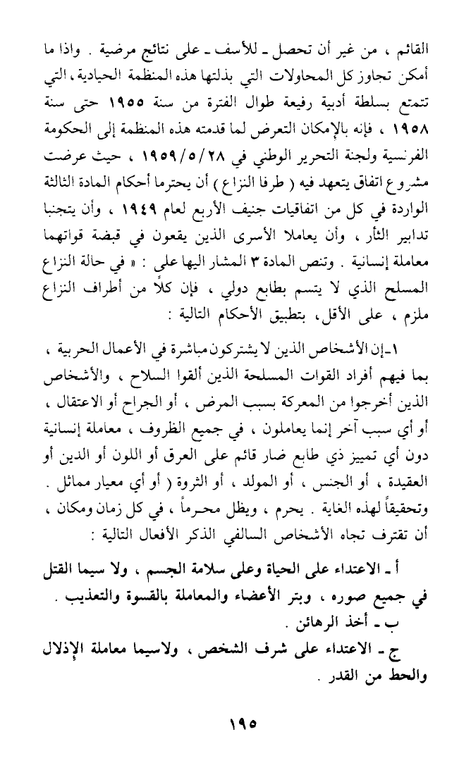 القائم، من غير أن تحصل - للأسف - على نتائج مرضية. واذا ما أمكن تجاوز كل المحاولات التي بذلتها هذه المنظمة الحيادية، التي تتمتع بسلطة أدبية رفيعة طوال الفترة من سنة 1955 حتى سنة 1958، فإنه بالإمكان التعرض لما قدمته هذه المنظمة إلى الحكومة الفرنسية ولجنة التحرير الوطني في 28/ 5 / 1959، حيث عرضت مشروع اتفاق يتعهد فيه (طرفا النزاع) أن يحترما أحكام المادة الثالثة الواردة في كل من اتفاقيات جنيف الأربع لعام 1949، وأن يتجنبا تدابير الثأر، وأن يعاملا الأسرى الذين يقعون في قبضة قواتهما معاملة إنسانية. وتنص المادة 3 المشار اليها على: (في حالة النزاع المسلح الذي لا يتسم بطابع دولي، فإن كلا من أطراف النزاع ملزم، على الأقل، بتطبيق الأحكام التالية: