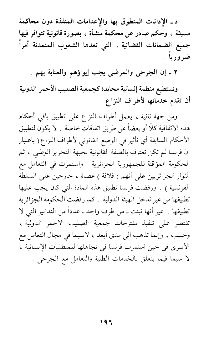 ومن جهة ثانية، يعمل أطراف النزاع على تطبيق باقي أحكام هذه الاتفاقية كلا أو بعضا عن طريق اتفاقات خاصة. لا يكون لتطبيق الأحكام السابقة أي تأثير في الوضع القانوني لأطراف النزاع (باعتبار أن فرنسا لم تكن تعترف بالصفة القانونية لجبهة التحرير الوطني، ثم الحكومة المؤقتة للجمهورية الجزائرية واستمرت في التعامل مع الثوار الجزائريين على أنهم (فلاقة) عصاة، خارجين على السلطة الفرنسية) ورفضت فرنسا تطبيق هذه المادة التي كان يجب عليها تطبيقها من غير تدخل الهيئة الدولية. كما رفضت الحكومة الجزائرية تطبيقها. غير أنها تبنت، - من طرف واحد - عددا من التدابير التي لا تقتصر على تنفيذ مقترحات جمعية الصليب الأحمر الدولية، وحسب، وإنما تذهب الى مدى أبعد، لاسيما في مجال التعامل مع الأسرى في حين استمرت فرنسا في تجاهلها للمتطلبات الإنسانية، لا سيما فيما يتعلق بالخدمات الطبية والتعامل مع الجرحى.