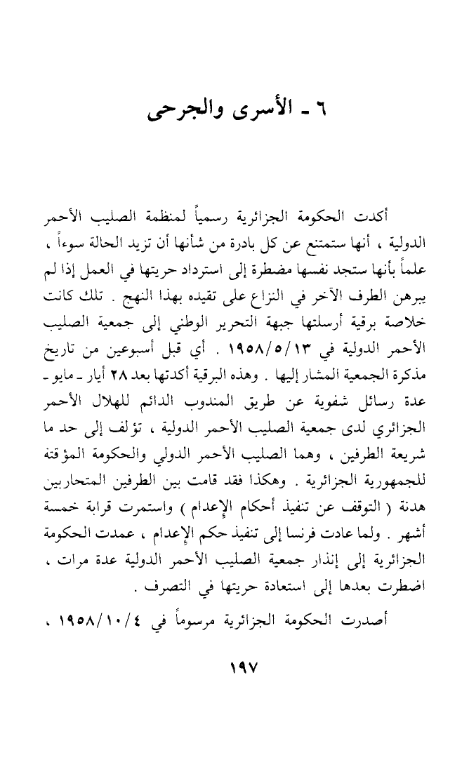 الأحمر الدولية في 13/ 5/ 1958. أي قبل أسبوعين من تاريخ مذكرة الجمعية المشار إليها. وهذه البرقية أكدتها بعد 28 أيار - مايو - عدة رسائل شفوية عن طريق المندوب الدائم للهلال الأحمر الجزائري لدى جمعية الصليب الأحمر الدولية، تؤلف إلى حد ما شريعة الطرفين، وهما الصليب الأحمر الدولي والحكومة المؤقتة للجمهورية الجزائرية. وهكذا فقد قامت بين الطرفين المتحاربين هدنة (التوقف عن تنفيذ أحكام الإعدام) واستمرت قرابة خمسة أشهر. ولما عادت فرنسا إلى تنفيذ حكم الإعدام، عمدت الحكومة الجزائرية إلى إنذار جمعية الصليب الأحمر الدولية عدة مرات، اضطرت بعدها إلى استعادة حريتها في التصرف.