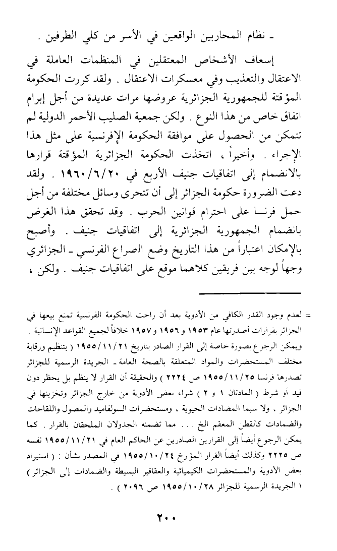 إسعاف الأشخاص المعتقلين في المنظمات العاملة في الاعتقال والتعذيب وفي معسكرات الاعتقال. ولقد كررت الحكومة المؤقتة للجمهورية الجزائرية عروضها مرات عديدة من أجل إبرام اتفاق خاص من هذا النوع. ولكن جمعية الصليب الأحمر الدولية لم تتمكن من الحصول على موافقة الحكومة الإفرنسية على مثل هذا الإجراء أخيرا، اتخذت الحكومة الجزائرية المؤقتة قرارها بالانضمام إلى اتفاقيات جنيف الأربع في 20/ 6/ 1960. ولقد دعت الضرورة حكومة الجزائر إلى أن تتحرى وسائل مختلفة من أجل حمل فرنسا على احترام قوانين الحرب وقد تحقق هذا الغرض بانضمام الجمهورية الجزائرية إلى اتفاقيات جنيف. وأصبح بالإمكان اعتبارا من هذا التاريخ وضع الصراع الفرنسي - الجزائري وجها لوجه من فريقين كلاهما موقع على اتفاقيات جنيف. ولكن،