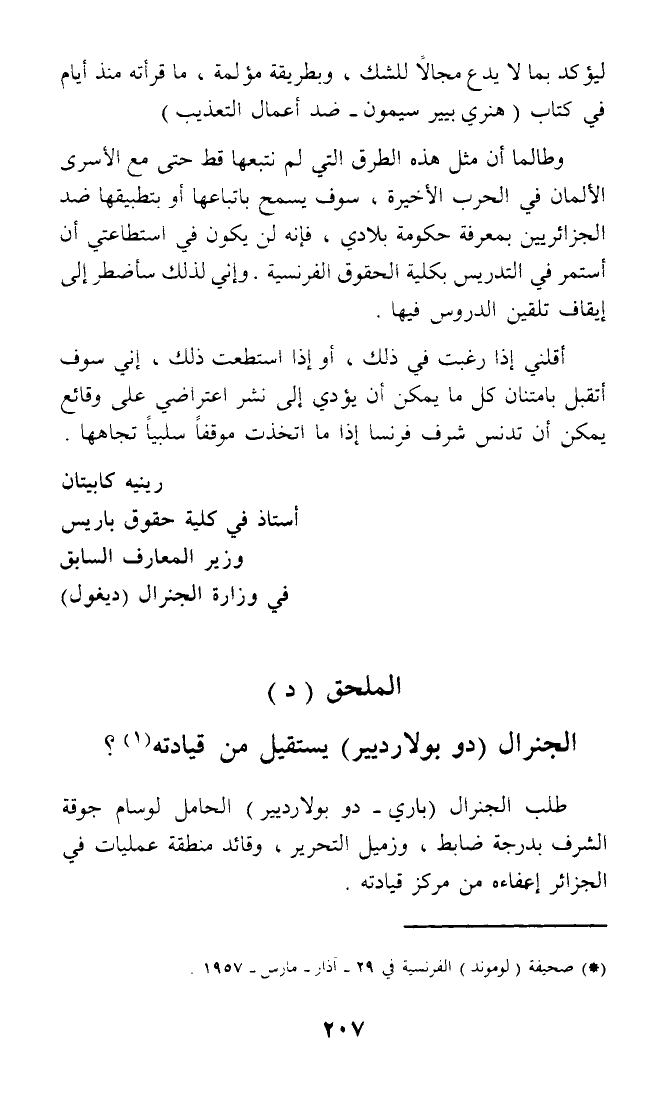 وطالما أن مثل هذه الطرق التي لم نتبعها قط حتى مع الأسرى الألمان في الحرب الأخيرة، سوف يسمح باتباعها أو بتطبيقها ضد الجزائريين بمعرفة حكومة بلادي، فإنه لن يكون في استطاعتي أن أستمر في التدريس بكلية الحقوق الفرنسية. وإني لذلك سأضطر إلى إيقاف تلقين الدروس فيها.