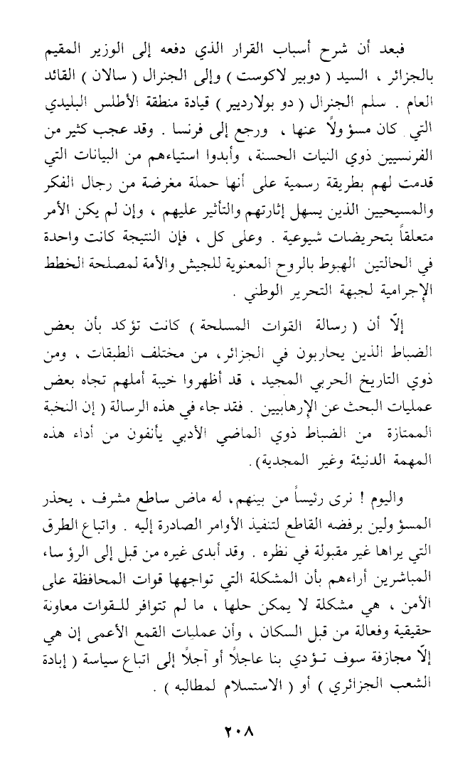 واليوم! نرى رئيسا من بينهم، له ماض ساطع مشرف، يحذر المسؤولين برفضه القاطع لتنفيذ الأوامر الصادرة إليه. واتباع الطرد التي يراها غير مقبولة في نظره. وقد أبدى غيره من قبل إلى الرؤساء المباشرين أراءهم بأن المشكلة التي تواجهها قوات المحافظة على الأمن، هي مشكلة لا يمكن حلها، ما لم تتوافر للقوات معاونة حقيقية وفعالة من قبل السكان، وأن عمليات القمع الأعمى إن هي إلا مجازفة سوف تؤدي بنا عاجلا أو آجلا إلى اتباع سياسة (إبادة الشعب الجزائري) أو (الاستسلام لمطالبه).