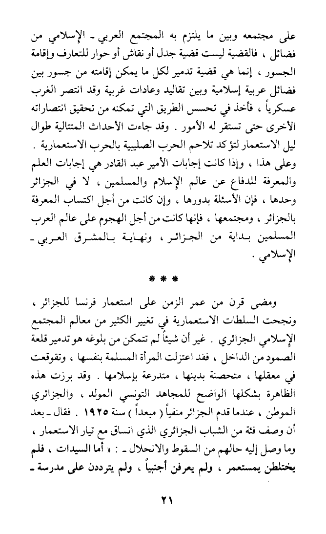 على مجتمعه وبين ما يلتزم به المجتمع العربي - الإسلامي من قضائل، فالقضية ليست قضية جدل أو نقاش أو حوار للتعارف وإقامة الجسور، إنما هي قضية تدمير لكل ما يمكن إقامته من جسور بين فضائل عربية إسلامية وبين تقاليد وعادات غربية وقد انتصر الغرب عسكريا، فأخذ في تحسس الطريق التي تمكنه من تحقيق انتصاراته الأخرى حتى تستقر له الأمور. وقد جاءت الأحداث المتتالية طوال ليل الاستعمار لتؤكد تلاحم الحرب الصليبية بالحرب الاستعمارية. وعلى هذا، وإذا كانت إجابات الأمير عبد القادر هي إجابات العلم والمعرفة للدفاع عن عالم الإسلام والمسلمين، لا في الجزائر وحدها، فإن الأسئلة بدورها، وإن كانت من أجل اكتساب المعرفة بالجزائر، ومجتمعها، فإنها كانت من أجل الهجوم على عالم العرب المسلمين بداية من الجزائر، ونهاية بالمشرق العربي - الإسلامي.