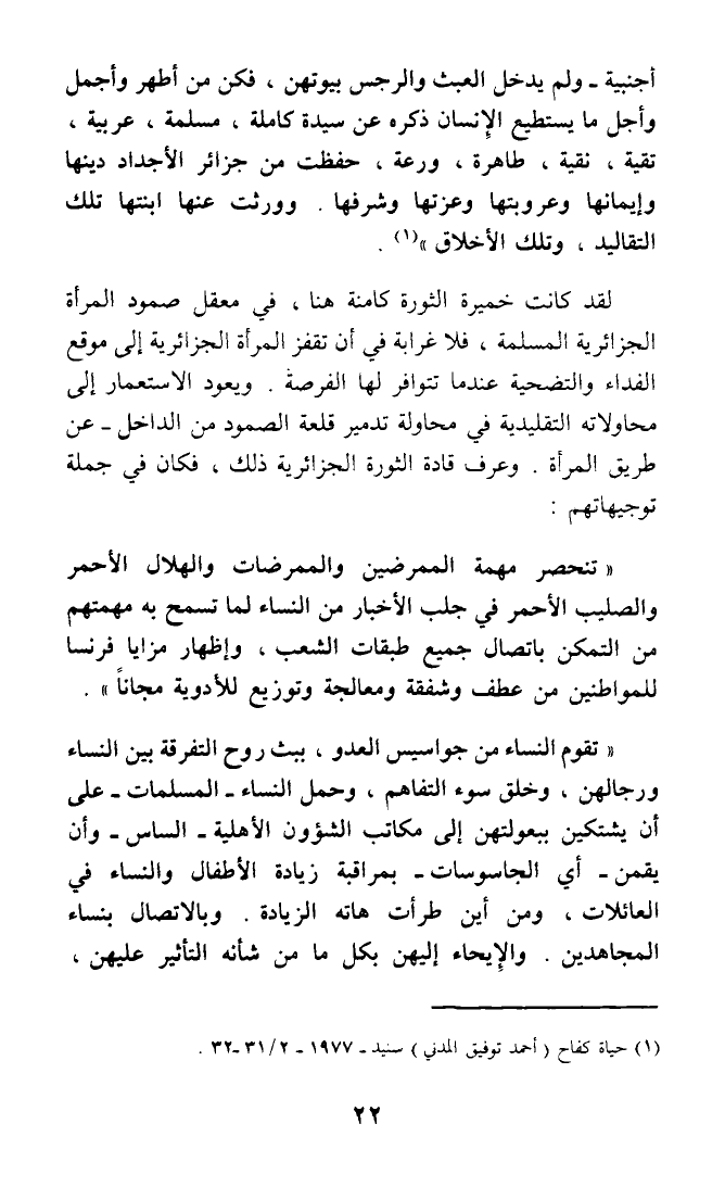 لقد كانت خميرة الثورة كامنة هنا، في معقل صمود المرأة الجزائرية المسلمة، فلا غرابة في أن تقفز المرأة الجزائرية إلى موقع الغداء والتضحية عندما تتوافر لها الفرصة. ويعود الاستعمار إلى محاولاته التقليدية في محاولة تدمير قلعة الصمود من الداخل - عن طريق المرأة. وعرف قادة الثورة الجزائرية ذلك، فكان في جملة توجيهاتهم: