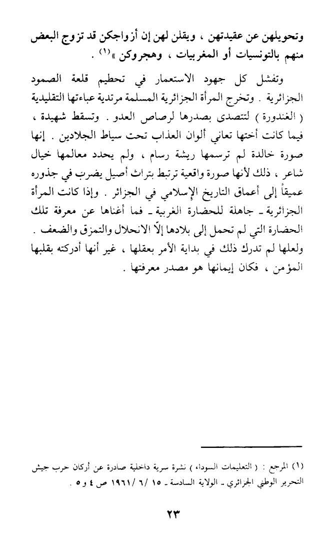 وتفشل كل جهود الاستعمار في تحطيم قلعة الصمود الجزائرية. وتخرج المرأة الجزائرية المسلمة مرتدية عباءتها التقليدية (الغندورة) لتتصدى بصدرها لرصاص العدو. وتسقط شهيدة، فيما كانت أختها تعاني ألوان العذاب تحت سياط الجلادين. إنها صورة خالدة لم ترسمها ريشة رسام، ولم يحدد معالمها خيال شاعر، ذلك لأنها صورة واقعية ترتبط بتراث أصيل يضرب في جذوره عميقا إلى أعماق التاريخ الإسلامي في الجزائر. وإذا كانت المرأة الجزائرية - جاهلة للحضارة الغربية - فما أغناها عن معرفة تلك الحضارة التي لم تحمل إلى بلادها إلا الانحلال والتمزق والضعف. ولعلها لم تدرك ذلك في بداية الأمر بعقلها، غير أنها أدركته بقلبها المؤمن، فكان إيمانها هو مصدر معرفتها.