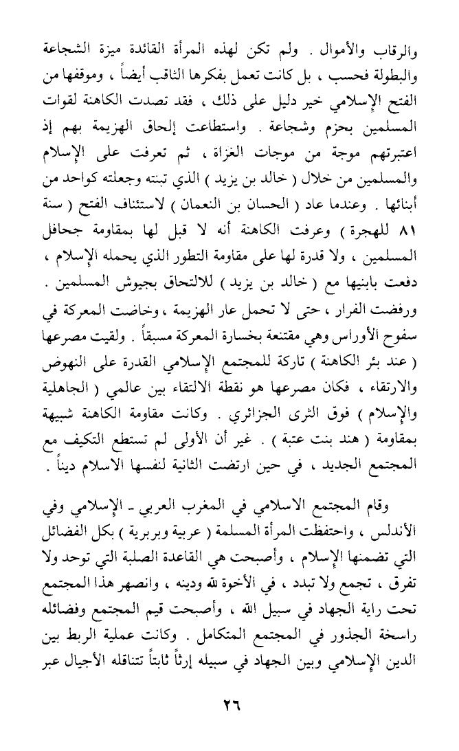 والرقاب والأموال. ولم تكن لهذه المرأة القائدة ميزة الشجاعة والبطولة فحسب، بل كانت تعمل بفكرها الثاقب أيضا، وموقفها من الفتح الإسلامي خير دليل على ذلك، فقد تصدت الكاهنة لقوات المسلمين بحزم وشجاعة. واستطاعت إلحاق الهزيمة بهم إذ اعتبرتهم موجة من موجات الغزاة، ثم تعرفت على الإسلام والمسلمين من خلال (خالد بن يزيد) الذي تبنته وجعلته كواحد من أبنائها. وعندما عاد (الحسان بن النعمان) لاستئناف الفتح (سنة 81 للهجرة) وعرفت الكاهنة أنه لا قبل لها بمقاومة جحافل المسلمين، ولا قدرة لها على مقاومة التطور الذي يحمله الإسلام، دفعت بابنيها مع (خالد بن يزيد) للالتحاق بجيوش المسلمين. ورفضت الفرار، حتى لا تحمل عار الهزيمة، وخاضت المعركة في سفوح الأوراس وهي مقتنعة بخسارة المعركة مسبقا. ولقيت مصرعها (عند بئر الكاهنة) تاركة للمجتمع الإسلامي القدرة على النهوض والارتقاء، فكان مصرعها هو نقطة الالتقاء بين عالمي (الجاهلية والإسلام) فوق الثرى الجزائري. وكانت مقاومة الكاهنة شبيهة بمقاومة (هند بنت عتبة). غير أن الأولى لم تستطع التكيف مع المجتمع الجديد، في حين ارتضت الثانية لنفسها الإسلام دينا.
