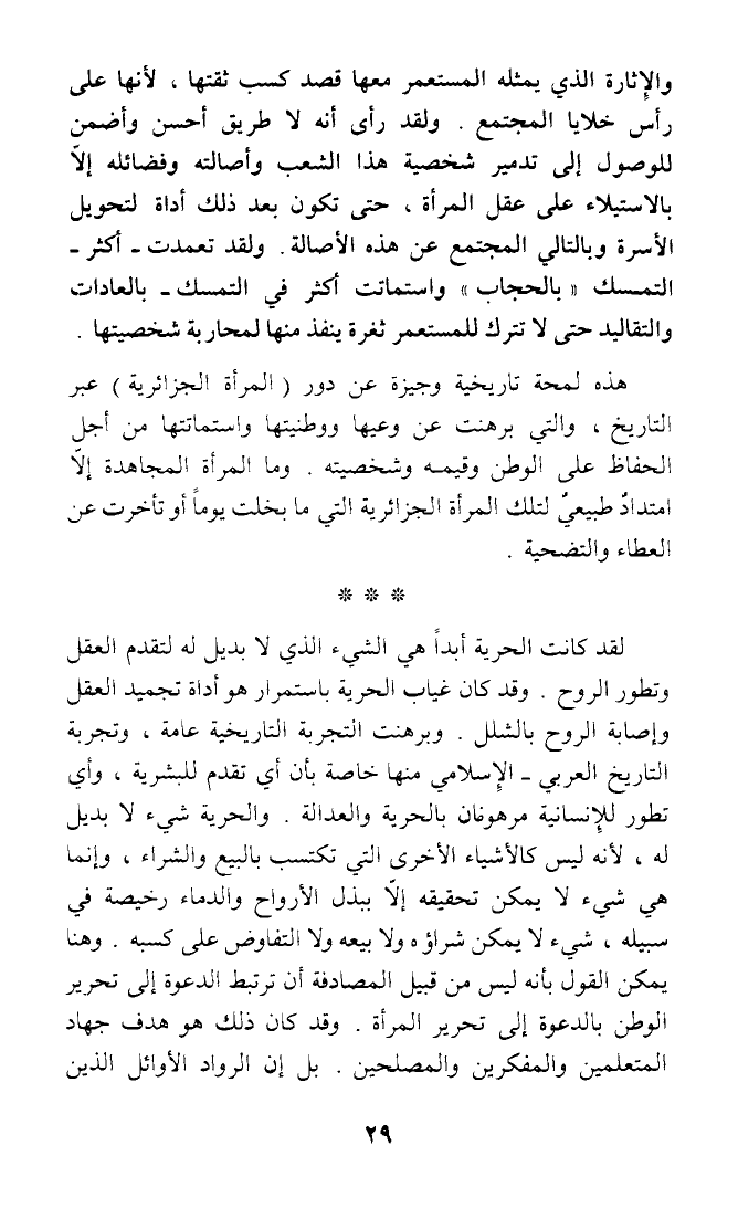 لقد كانت الحرية أبدا هي الشيء الذي لا بديل له لتقدم العقل وتطور الروح. وقد كان غياب الحرية باستمرار هو أداة تجميد العقل وإصابة الروح بالشلل. وبرهنت التجربة التاريخية عامة، وتجربة التاريخ العربي - الإسلامي منها خاصة بأن أي تقدم للبشرية، وأي تطور للانسانية مرهونان بالحرية والعدالة. والحرية شيء لا بديل له، لأنه ليس كالأشياء الأخرى التي تكتب بالبيع والشراء، وإنما هي شيء لا يمكن تحقيقه إلا ببذل الأرواح والدماء رخيصة في سبيله، شيء لا يمكن شراؤه ولا بيعه ولا التفاوض على كسبه. وهنا يمكن القول بأنه ليس من قبيل المصادفة أن ترتبط الدعوة إلى تحرير الوطن بالدعوة إلى تحرير المرأة. وقد كان ذلك هو هدف جهاد المتعلمين والمفكرين والمصلحين - بل إن الرواد الأوائل الذين