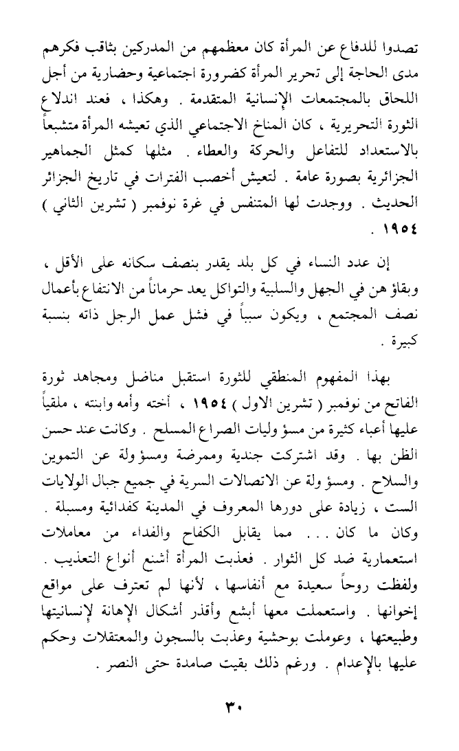 تصدوا للدفاع عن المرأة كان معظمهم من المدركين بثاقب فكرهم مدى الحاجة إلى تحرير المرأة كضرورة اجتماعية وحضارية من أجل اللحاق بالمجتمعات الإنسانية المتقدمة. وهكذا، فعند اندلاع الثورة التحريرية، كان المناخ الاجتماعي الذي تعيشه المرأة متشبعا بالاستعداد للتفاعل والحركة والعطاء. مثلها كمثل الجماهير الجزائرية بصورة عامة. لتعيش أخصب الفترات في تاريخ الجزائر الحديث. ووجدت لها المتنفس في غرة نوفمبر (تشرين الثاني) 1954.