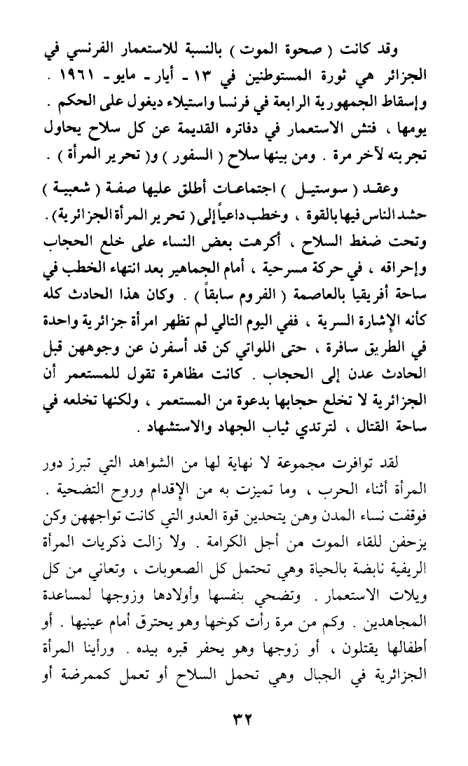 وقد كانت (صحوة الموت) بالنسبة للاستعمار الفرنسي في الجزائر هي ثورة المستوطنين في 13 - أيار - مايو - 1961.وإسقاط الجمهورية الرابعة في فرنسا واستيلاء ديغول على الحكم. يومها، فتش الاستعمار في دفاتره القديمة عن كل سلاح يحاول تجربته لأخر مرة. ومن بينها سلاح (السفور) و (تحرير المرأة).