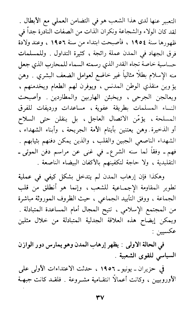 وهكذا فإن إرهاب المدن لم يتدخل بشكل كيفي في عملية تطوير المقاومة الإجماعية للشعب، وإنما هو انطلق من قلب الجماعة، ووفق التأييد الجماعي، حيث الظروف الموروثة مباشرة من المجتمع الإسلامي، تتيح المجال أمام المساعدة المتبادلة. ويمكن إيضاح هذه العلاقة الجدلية المتبادلة من خلال مثلين عكسيين: