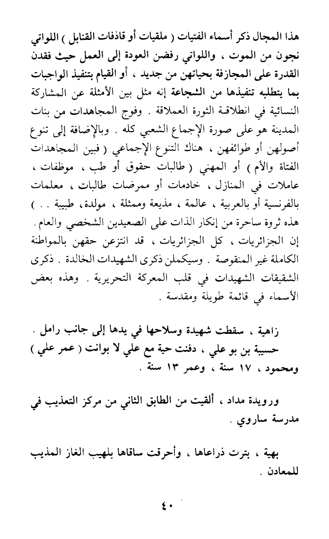 هذا المجال ذكر أسماء الفتيات (ملقيات أو قاذفات القنابل) اللواتي نجون من الموت، واللواتي رفضن العودة إلى العمل حيث فقدن القدرة على المجازفة بحياتهن من جديد، أو القيام بتنفيذ الواجبات بما يتطلبه تنفيذها من الشجاعة إنه مثل بين الأمثلة عن المشاركة النسائية في انطلاقة الثورة العملاقة. وفوج المجاهدات من بنات المدينة هو على صورة الإجماع الشعبي كله. وبالإضافة إلى تنوع أصولهن أو طوائفهن، هناك التنوع الإجماعي (فبين المجاهدات الفتاة والأم) أو المهني (طالبات حقوق أو طب، موظفات، عاملات في المنازل، خادمات أو ممرضات طالبات، معلمات بالفرنسية أو بالعربية، عالمة، مذيعة وممثلة، مولدة، طبيبة ..) هذه ثروة ساحرة من إنكار الذات على الصعيدين الشخصي والعام. إن الجزائريات، كل الجزائريات، قد انتزعن حقهن بالمواطنة الكاملة غير المنقوصة. وسيكملن ذكرى الشهيدات الخالدة ذكرى الشقيقات الشهيدات في قلب المعركة التحريرية. وهذه بعض الأسماء في قائمة طويلة ومقدسة.