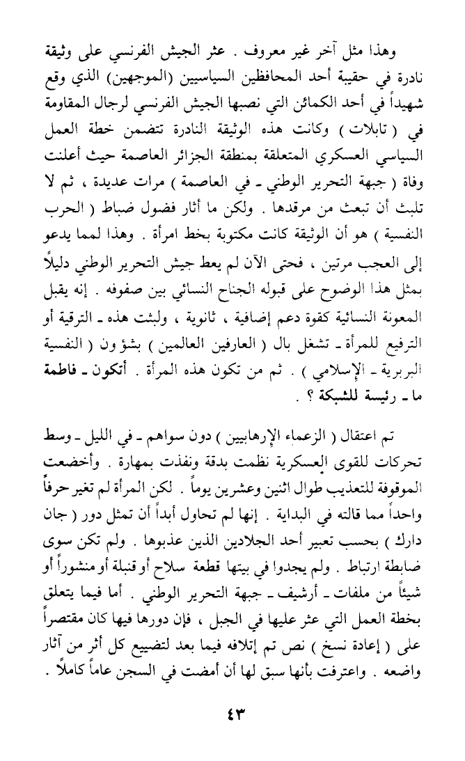 وهذا مثل آخر غير معروف. عثر الجيش الفرنسي على وثيقة نادرة في حقيبة أحد المحافظين السياسيين (الموجهين) الذي وقع شهيدا في أحد الكمائن التي نصبها الجيش الفرنسي لرجال المقاومة في (تابلات) وكانت هذه الوثيقة النادرة تتضمن خطة العمل السياسي العسكري المتعلقة بمنطقة الجزائر العاصمة حيث أعلنت وفاة (جبهة التحرير الوطني - في العاصمة) مرات عديدة، ثم لا تلبث أن تبعث من مرقدها. ولكن ما أثار فضول ضباط (الحرب النفسية) هو أن الوثيقة كانت مكتوبة بخط امرأة. وهذا لمما يدعو إلى العجب مرتين، فحتى الآن لم يعط جيش التحرير الوطني دليلا بمثل هذا الوضوح على قبوله الجناح النسائي بين صفوفه. إنه يقبل المعونة النسائية كقوة دعم إضافية، ثانوية، ولبثت هذه - الترقية أو الترفيع للمرأة - تشغل بال (العارفين العالمين) بشؤون (النفسية البربرية - الإسلامي). ثم من تكون هذه المرأة. أتكون - فاطمة ما - رئيسة للشبكة؟.