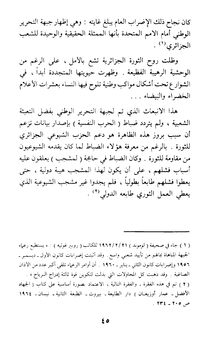 (¬1) جاء فى صحيفة (لوموند) 21/ 2/ 1962 للكاتب (روبير غوتيه): (يستطيع زعماء الجبهة المباهاة بمالهم من تأييد شعبي واسع. وقد أثبتت إضرابات كانون الأول - ديسمبر - 1956 وإضرابات كانون الثاني - يناير - 1960. أن أوامر الزعماء تلقى أكبر عدد من الآذان الصاغية. وقد ذهبت كل المحاولات التي بدلت لتكوين قوة ثالثة إدراج الرياح).