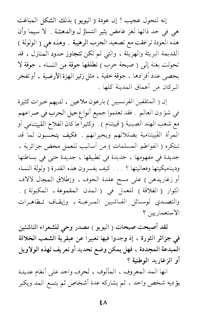 إن (المثقفين الفرنسيين) بارعون ملاعين، لديهم خبرات كثيرة في شؤون العالم. فقد تعلموا جميع أنواع حيل الحرب في صراعهم مع شعب الهند الصينية (فييتنام). وكثيرا ما كان الفلاح الفييتنامي أو المرأة الفييتنامية يضللانهم ويحيرانهم. فكيف يتحسبون لما قد تبتكره (الفواطم المسلمات) من أساليب للعمل محض جزائرية، جديدة في مفهومها، جديدة في تطبيقها، جديدة حتى في بساطتها وديناميكيتها وفعاليتها؟ ... كيف يفسرون هذه القدرة (ولولة النساء أو زغاريدهن) على مسح عقدة الخوف، وإطلاق المجال لآلاف الثوار (الفلاقة) للعمل في (المدن المقموعة - المكبوتة). والتصدي لوسائل الفاشيين المرعبة، وإيقاف تظاهرات الاستعماريين؟
