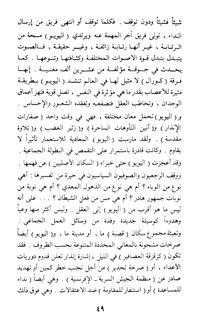 شيئا فشيئا ودون توفف. فكلما توقف أو انتهى فريق من إرسال النداء، تولى فريق آخر المهمة عنه ويرتدي (اليويو) مسحة من الرتابة، غير أنها رتابة زائفة، وغير حقيقة، فالصوت يتبدل بتبدل قوة الاصوات المختلفة وكثافتها وتنوعها. كما يحدث في جوقة مؤلفة من عشرين ألف مغنية. إنها فرقة (كورال) لا مثيل لها في العالم تنشد (اليويو) بطريقة مثيرة للأعصاب بقدر ما هي مؤثرة في النفس، تصل قوية فتهز أعماق الوجدان، وتخاطب العقل فتصفعه وتفقده الشعور والإحساس. و (اليويو) تحمل معان مختلفة، فهي في وقت واحد (صفارات الإنذار) و (أنين التأوهات الساحرة) و (زئير الغضب) و (تلاوة مقدسة) , ولقد مارست (اليويو) المعادية للاستعمار تأثيرا لا يقاوم. وكانت قادرة باستمرار على التقمص في البطولة الجماعية وقد أعجزت (اليويو) حتى خبراء (السكان الأصليين) عن فهمها. ووقف الرجعيون والصوفيون السياسيون في حيرة من تفسيرها: أهي نوع من الوباء؟ أم هي نوع من الذهول المعدي؟ أم هي نوبة من نوبات جمهور هادر؟ أم هي مس من فعل الشيطان؟ ... على أنه ليس ما هو أقرب من (اليويو) إلى العقل. وليس أكثر منها وعيا وهدوءا كوسيلة جديدة وفذة من وسائل العمل الجماعي. وتعبئة مجموع سكان (قصبة) ما، أو مدينة ما، و (اليويو) أيضا صرخات مشحونة بالمعاني المحددة المتنوعة بحسب الظروف. فقد تكون (كزقزقة العصافير) في الليل، إشارة إنذار تعلن قدوم دوريات الأعداء، أو (صرخة تحذير) من أجل تجنب خطر كمين أو تهديد صادر عن (منظمة الجيش السرية - الإفرنسية). وهي أيضا (نداء للمساعدة) أو (استنفار للمقاومة) ضد الاعتقالات. وهي فوق ذلك