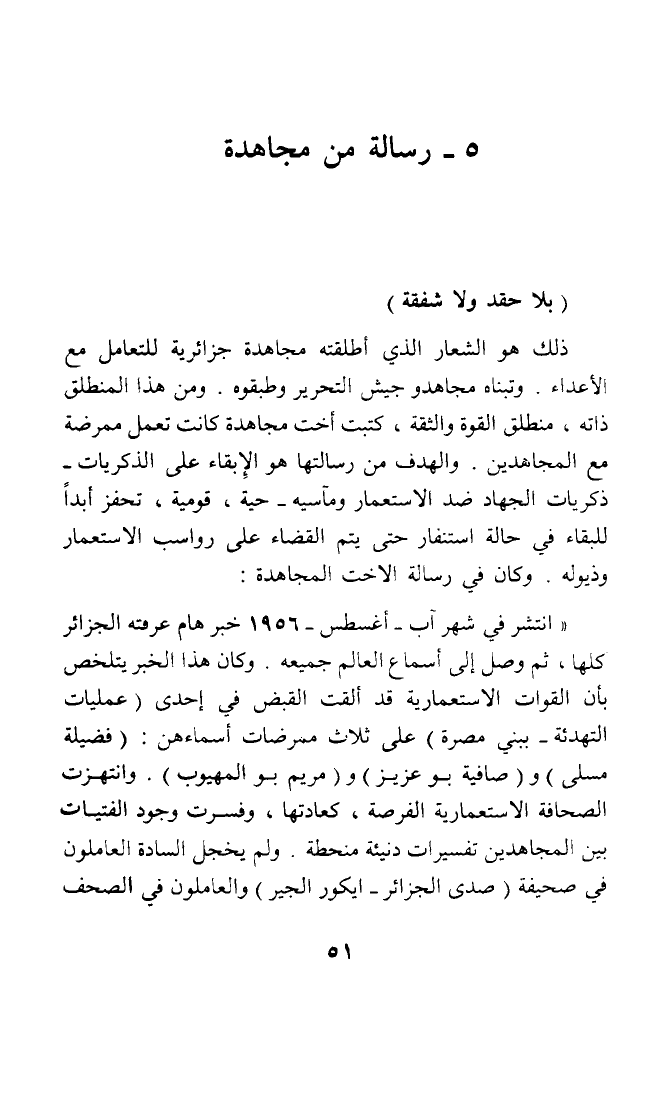 ذلك هو الشعار الذي أطلقته مجاهدة جزائرية للتعامل مع الأعداء. وتبناه مجاهدو جيش التحرير وطبقوه. ومن هذا المنطلق ذاته، منطلق القوة والثقة، كتبت أخت مجاهدة كانت تعمل ممرضة مع المجاهدين. والهدف من رسالتها هو الإبقاء على الذكريات - ذكريات الجهاد ضد الاستعمار ومآسيه - حية، قومية، تحفز أبدا للبقاء في حالة استنفار حتى يتم القضاء على رواسب الاستعمار وذيوله. وكان في رسالة الأخت المجاهدة: