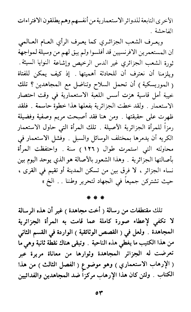 تلك مقتطفات من رسالة (أخت مجاهدة) غير أن هذه الرسالة لا تكفي لإعطاء صورة كاملة عما قامت به المرأة الجزائرية المجاهدة. ولعل في (القصص الوثائقية) الواردة في القسم الثاني من هذا الكتيب ما يغطي هذه الناحية. وتبقى هناك نقطة ثانية وهي ما تعرضت له الجزائر المجاهدة وثوارها من معاناة مريرة عبر (الإرهاب الاستعماري) وهو موضوع (الفصل الثالث) من هذا الكتاب. ولئن كان هذا الإرهاب مركزا ضد المجاهدين والفدائيين