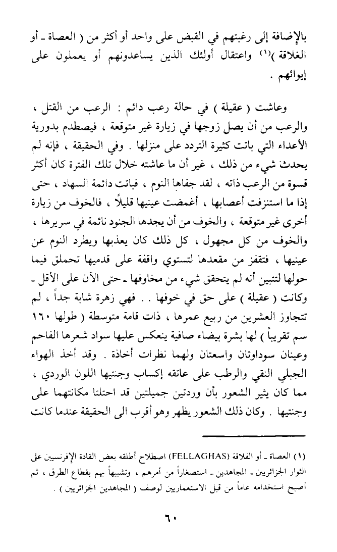 وعاشت (عقيلة) في حالة رعب دائم: الرعب من القتل، والرعب من أن يصل زوجها في زيارة غير متوقعة، فيصطدم بدورية الأعداء التي باتت كثيرة التردد على منزلها. وفي الحقيقة، فإنه لم يحدث شيء من ذلك، غير أن ما عاشته خلال تلك الفترة كان أكثر قسوة من الرعب ذاته، لقد جفاها النوم، فباتت دائمة السهاد، حتى إذا ما استنزفت أعصابها، أغمضت عينيها قليلا، فالخوف من زيارة أخرى غير متوقعة، والخوف من أن يجدها الجنود نائمة في سريرها، والخوف من كل مجهول، كل ذلك كان يعذبها ويطرد النوم عن عينيها، فتقفز من مقعدها لتستوي واقفة على قدميها تحملق فيما حولها لتتبين أنه لم يتحقق شيء من مخاوفها - حتى الآن على الأقل - وكانت (عقيلة) على حق في خوفها .. فهي زهرة شابة جدا، لم تتجاوز العشرين من ربيع عمرها، ذات قامة متوسطة (طولها 160 سم تقريبا) لها بشرة بيضاء صافية ينعكس عليها سواد شعرها الفاحم وعينان سوداوتان واسعتان ولهما نظرات أخاذة. وقد أخذ الهواء الجبلي النقي والرطب على عاتقه إكساب وجنتيها اللون الوردي، مما كان يثير الشعور بأن وردتين جميلتين قد احتلتا مكانتهما على وجنتيها. وكان ذلك الشعور يظهر وهو أقرب الى الحقيقة عندما كانت