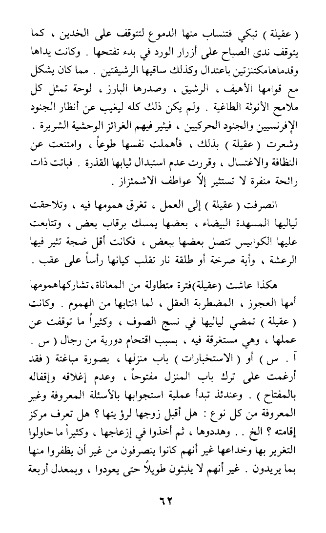 (عقيلة) تبكي فتنساب منها الدموع لتتوقف على الخدين، كما يتوقف ندى الصباح على أزرار الورد في بدء تفتحها. وكانت يداها وقدماها مكتنزتين باعتدال وكذلك ساقيها الرشيقتين. مما كان يشكل مع قوامها الأهيف، الرشيق، وصدرها البارز، لوحة تمثل كل ملامح الأنوثة الطاغية. ولم يكن ذلك كله ليغيب عن أنظار الجنود الإفرنسيين والجنود الحركيين، فيثير فيهم الغرائز الوحشية الشريرة. وشعرت (عقيلة) بذلك، فأهملت نفسها طوعا، وامتنعت عن النظافة والاغتسال، وقررت عدم استبدال ثيابها القذرة. فباتت ذات رائحة منفرة لا تستثير إلا عواطف الاشمئزاز.