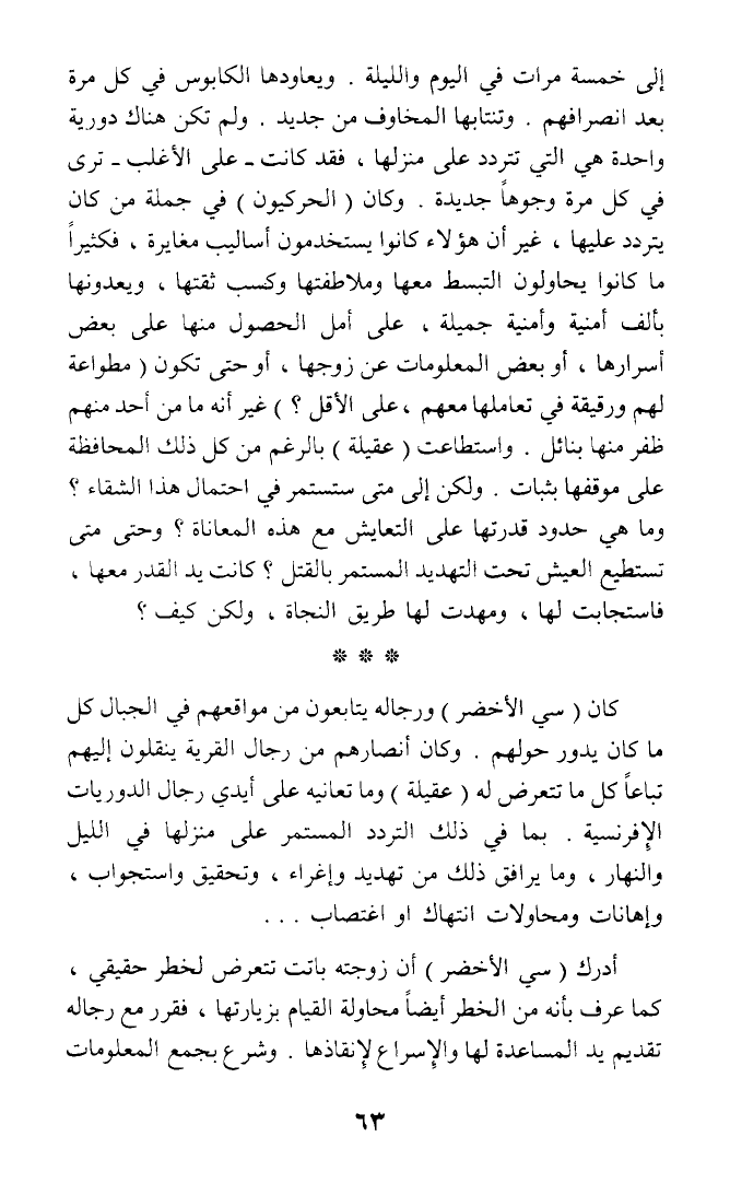 إلى خمسة مرات في اليوم والليلة. ويعاودها الكابوس في كل مرة بعد انصرافهم. وتنتابها المخاوف من جديد. ولم تكن هناك دورية واحدة هي التي تتردد على منزلها، فقد كانت - على الأغلب - ترى في كل مرة وجوها جديدة. وكان (الحركيون) في جملة من كان يتردد عليها، غير أن هؤلاء كانوا يستخدمون أساليب مغايرة، فكثيرا ما كانوا يحاولون التبسط معها وملاطفتها وكسب ثقتها، ويعدونها بألف أمنية وأمنية جميلة، على أمل الحصول منها على بعض أسرارها، أو بعض المعلومات عن زوجها، أو حتى تكون (مطواعة لهم ورقيقة في تعاملها معهم، على الأقل؟) غير أنه ما من أحد معهم ظفر منها بنائل. واستطاعت (عقيلة) بالرغم من كل ذلك المحافظة على موقفها بثبات. ولكن إلى متى ستستمر في احتمال هذا الشقاء؟ وما هي حدود قدرتها على التعايش مع هذه المعاناة؟ وحتى متى تستطيع العيش تحت التهديد المستمر بالقتل؟ كانت يد القدر معها، فاستجابت لها، ومهدت لها طريق النجاة، ولكن كيف؟
