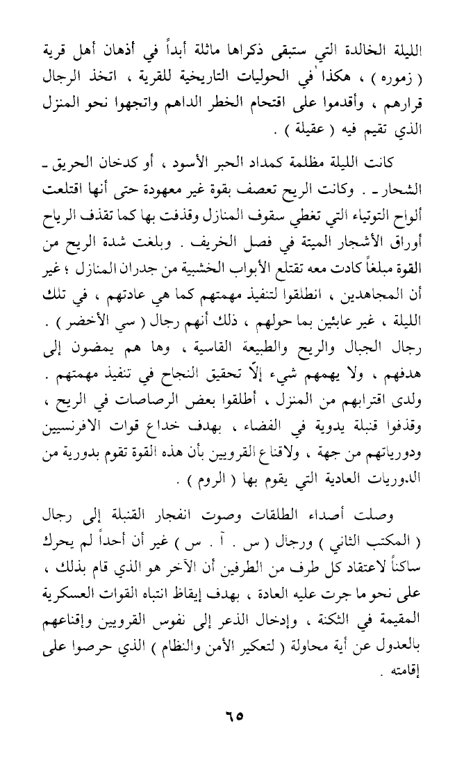 كانت الليلة مظلمة كمداد الحبر الأسود، أو كدخان الحريق - الشحار -. وكانت الريح تعصف بقوة غير معهودة حتى أنها اقتلعت ألواح التوتياء التي تغطي سقوف المنازل وقذفت بها كما تقذف الرياح أوراق الأشجار الميتة في فصل الخريف. وبلغت شدة الريح من القوة مبلغا كادت معه تقتلع الأبواب الخشبية من جدران المنازل؛ غير أن المجاهدين، انطلقوا لتنفيذ مهمتهم كما هي عادتهم، في تلك الليلة، غير عابئين بما حولهم، ذلك أنهم رجال (سي الأخضر). رجال الجبال والريح والطبيعة القاسية، وها هم يمضون إلى