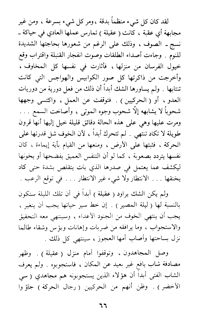 لقد كان كل شيء منظما بدقة، ومر كل شيء بسرعة، ومن غير مجابهة أي عقبة، كانت (عقيلة) تمارس عملها العادي في حياكة نسج - الصوف، وذلك على الرغم من شعورها بحاجتها الشديدة للنوم. وجاءت أصداء الطلقات وصوت انفجار القنبلة واقتراب وقع خيول الفرسان من منزلها، فأثارت في نفسها كل المخاوف، وأخرجت من ذاكرتها كل صور الكوابيس والهواجس التي كانت تنتابها. ولم يساورها الشك أبدا أن ذلك من فعل دورية من دوريات العدو، أو (الحركيين). فتوقفت عن العمل، واكتسى وجهها شحوبا لا يشابهه إلا شحوب وجوه الموتى، وأصاخت السمع ... ومرت عليها وهي على هذه الحالة دقائق قليلة خيل إليها أنها قرون طويلة لا تكاد تنتهي. لم تتحرك أبدا، لأن الخوف شل قدرتها على الحركة، فثبتها على الأرض، ومنعها من القيام بأية إيماءة، كان نفسها يتردد بصعوبة، كما لو أن التنفس العميق يفضحها أو يخونها ليكشف عما يعتمل في صدرها الذي بات يتقلص بشدة حتى كاد يخنقها ... الانتظار ولا شيء غير الانتظار ... في توقع الرعب.